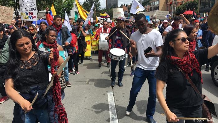 Otro reclamo clave de las protestas es la protección a los pueblos indígenas en Colombia. Sus líderes denuncian que están sufriendo un genocidio. Desde la firma del tratado de paz, 198 indígenas han sido asesinados en el país. Darwin Duque, vicepresidente nacional de ANTHOC, la Asociación Nacional Sindical de Trabajadores de la Salud, es del Departamento del Cauca – una de las regiones más convulsas de Colombia: “Alli se han venido originando una serie de asesinatos sistemáticos de líderes sociales, populares e indígenas que solicitan el derecho a vivir en paz y a que les respeten los territorios”.